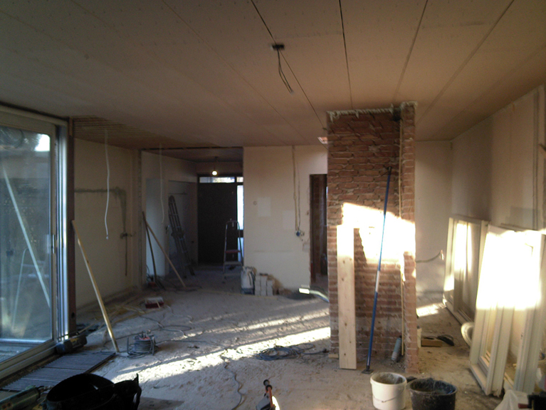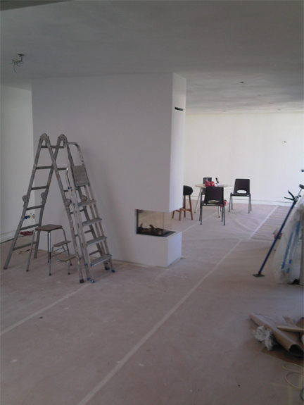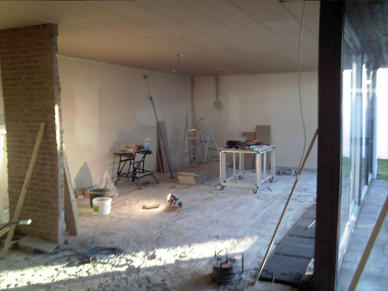 vloer betegeld, wanden gestuct, alles een kleurtje gegeven en tevens een openhaard geplaast.
