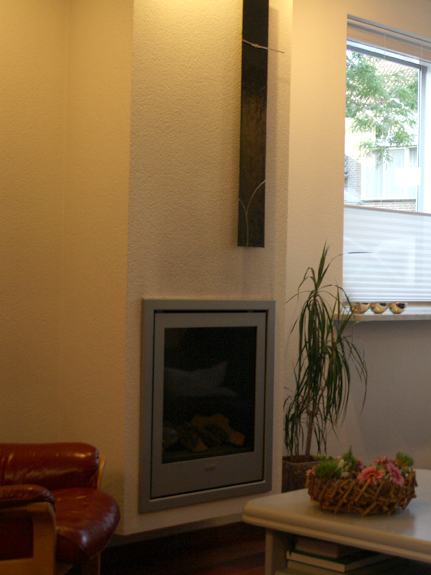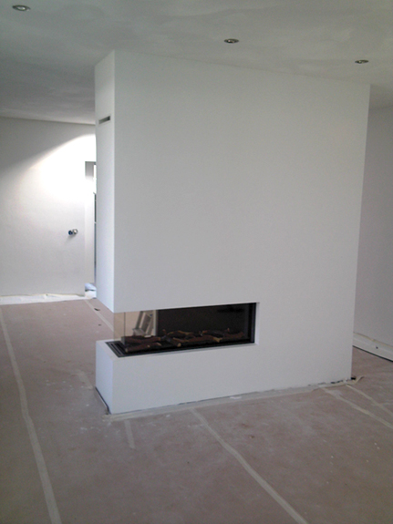 Zwevende schouw, het plaatsen en het aansluiten van de gasleidingen van de kachel, het installeren van de kachel en de afwerking van de ombouw.