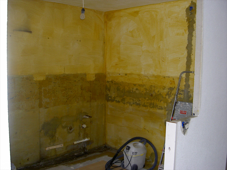 muren uitgevlakt en het nieuwe keukenblok geplaatst.